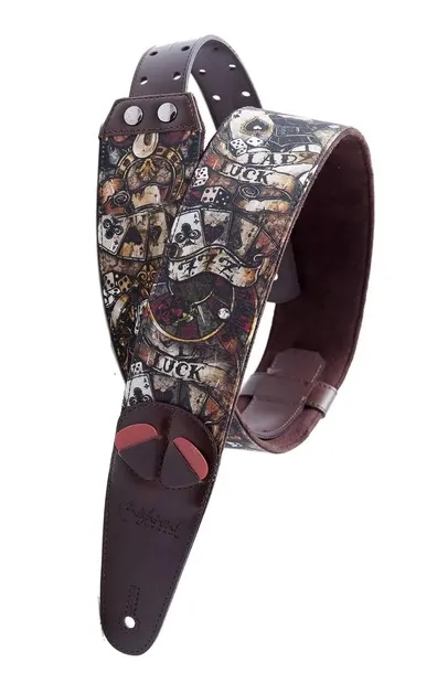 Motywem paska gitarowego RightOn Mojo Lady Luck jest przypadek. Kości, karty do pokera, diamenty przewijają się przez całą długość. Piękne ryciny wykonała artystka współpracująca z firmą RightOn Straps Xania Grey.